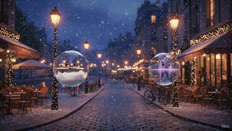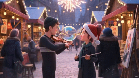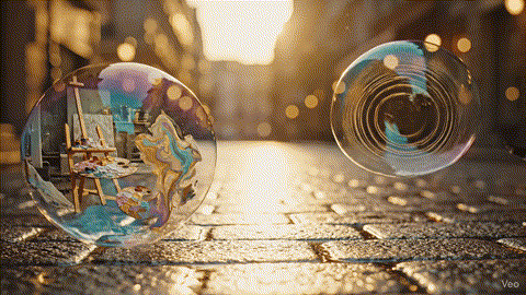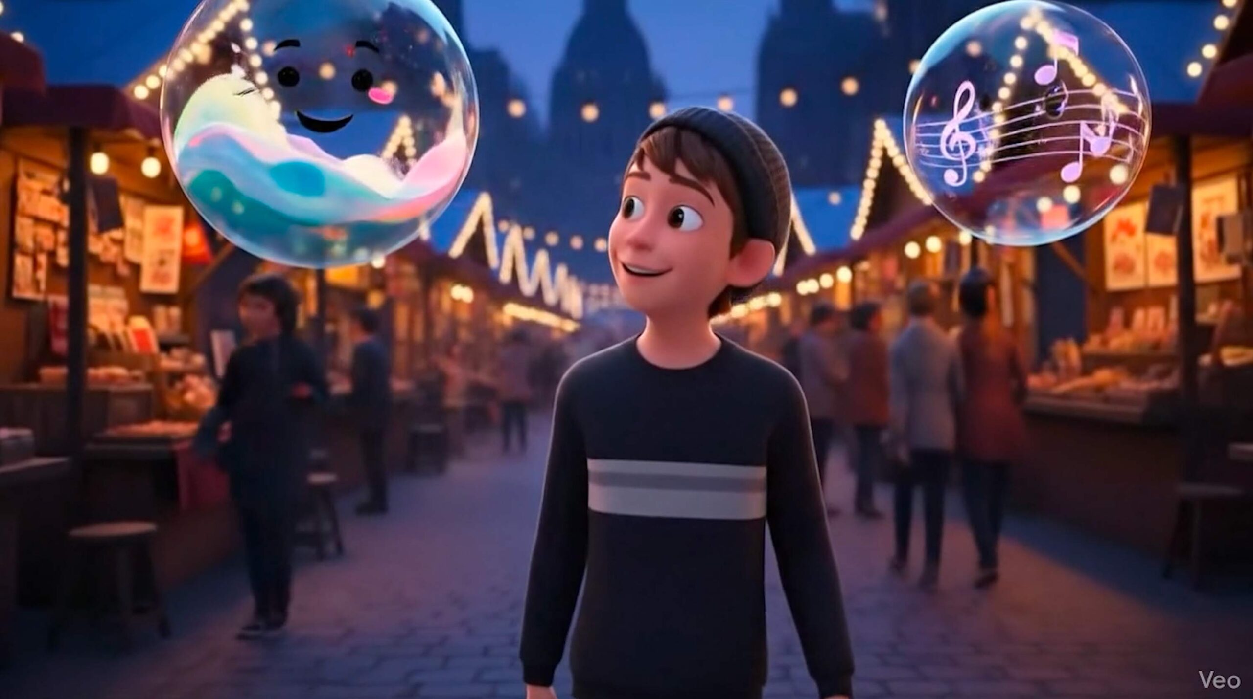 As these bubbles navigate the city, interacting with galleries and street music, they eventually collide, leading the two creators to a shared future and an unexpected encounter in a bustling market.