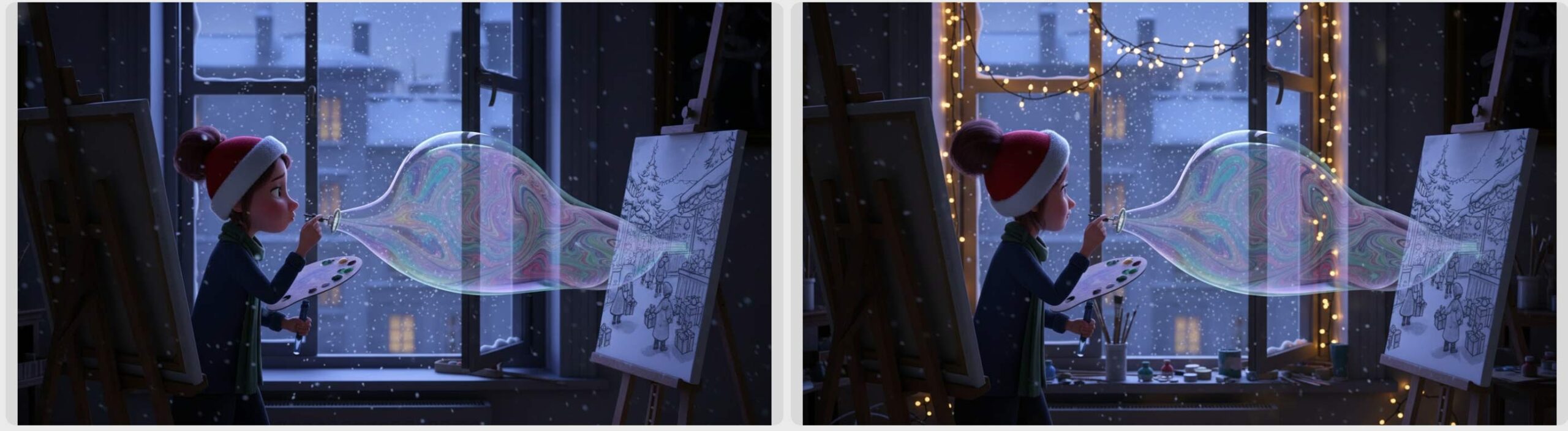 Camera: Slow push-in as she steps toward the window, her silhouette framed by falling snow outside. Keep her face obscured or softly indistinct. Environment: Snow drifts down in soft motion, casting cool blue tones into the studio. On the window sill sits a familiar bubble wand, catching a warm highlight from the lamp behind her.