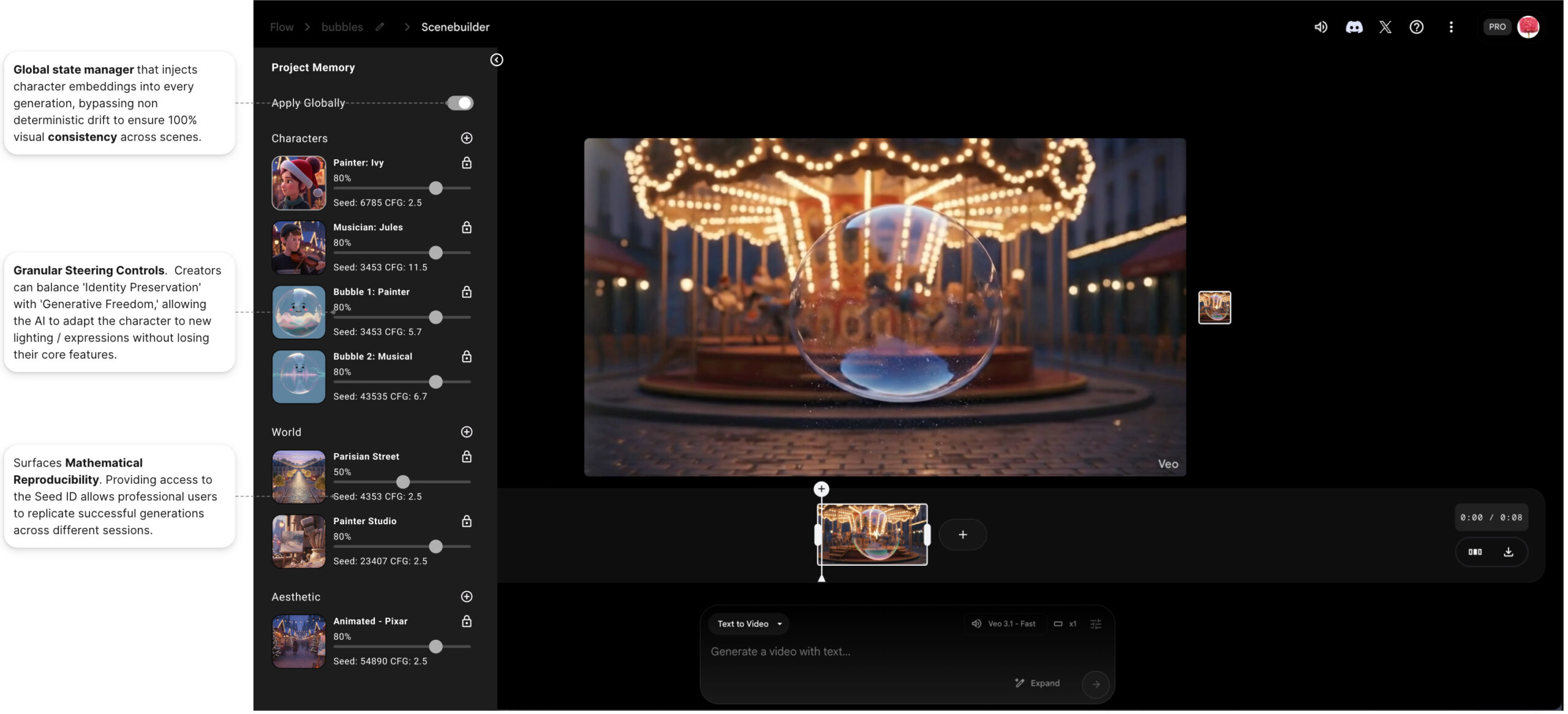 - Global Style Settings: A dedicated sidebar tray to “pin” character and environment references, solving the “Consistency Paradox” of non-deterministic AI.