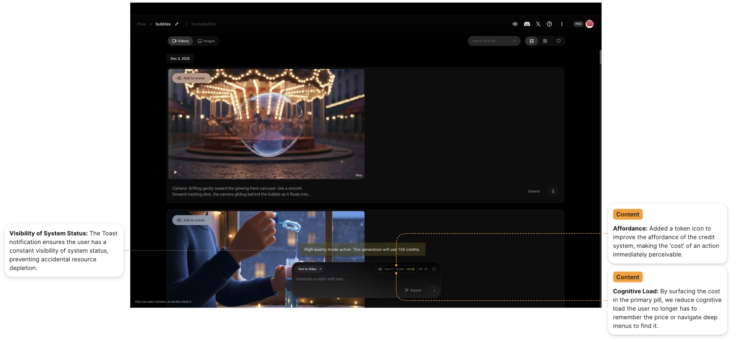 Product Insight: The interface lacks “Visibility of System Status.” I inadvertently spent 200 tokens (50% of my trial budget) because the “Veo Quality 3.1” setting, which costs 100 tokens per generation was active and the token cost is only visible after clicking on the quality text, which lacks a hover interaction. This highlights a critical need for budget-transparency in high-cost generative tools.