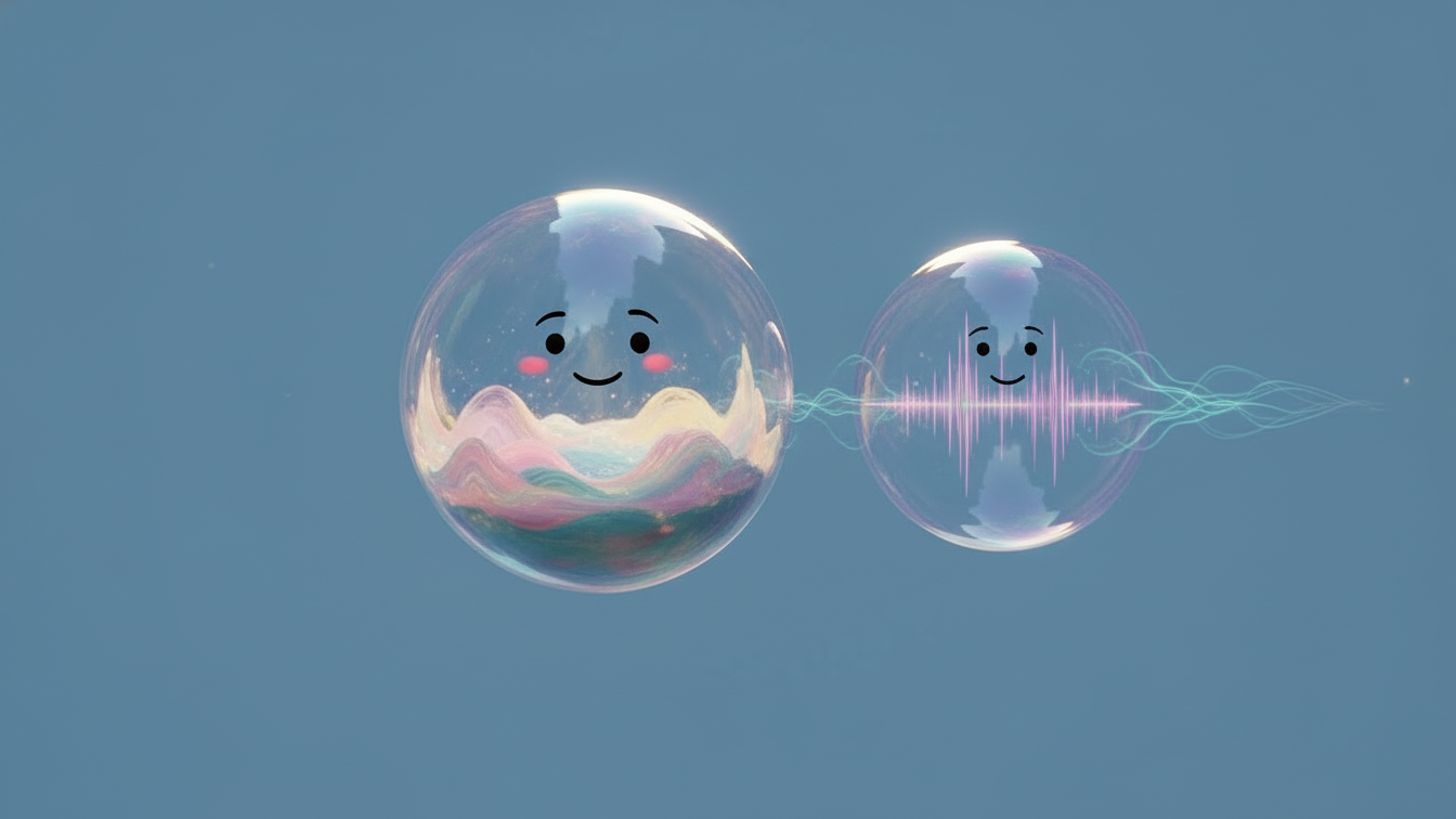 Action: She picks it up delicately, lifts it to her lips, and blows a gentle breath. Magical Realism: A single bubble forms, shimmering with subtle warm-and-cool light patterns—as if responding to her emotion. It drifts upward, weightless and hopeful.