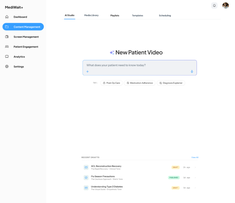 - Smart Media Library: A unified library that uses AI to organize assets. Doctors can search for content by “mood” or “vibe” (like Calming or Educational) rather than just searching for filenames.