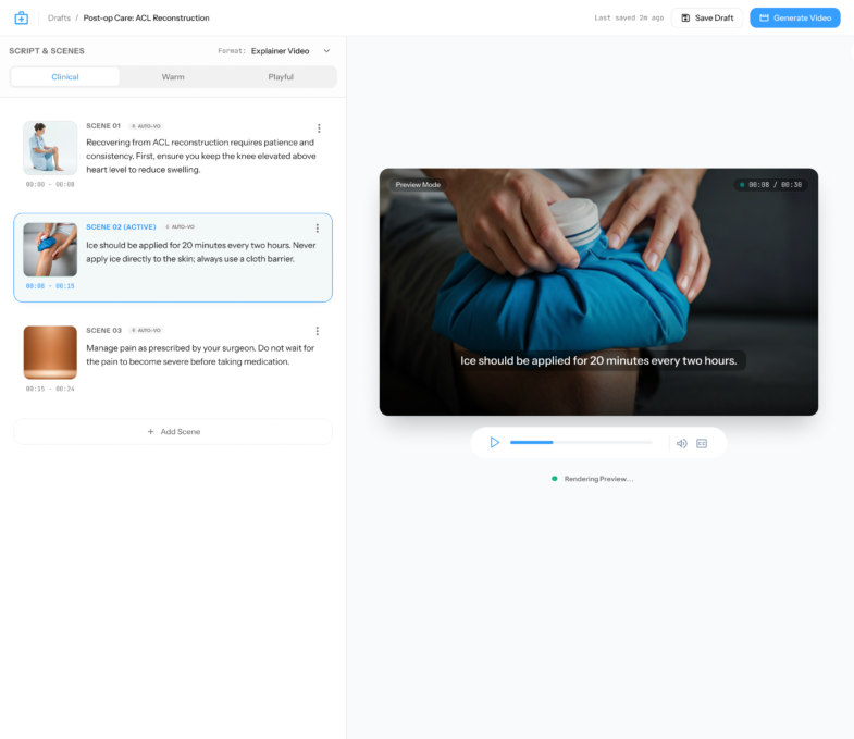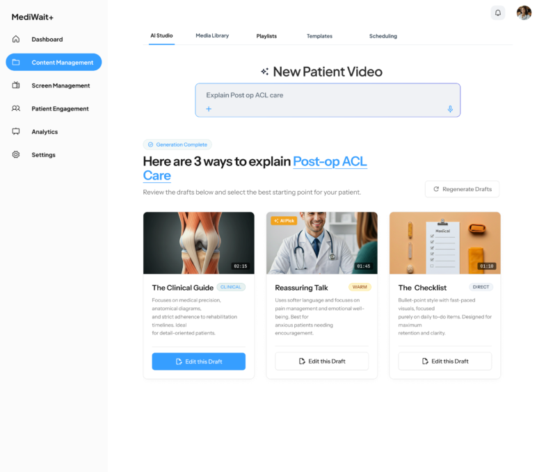 - AI Studio (The Fast Path): The primary tool for busy staff. Doctors can type a clinical goal, and the AI generates three cinematic storyboards to choose from, saving hours of manual work.