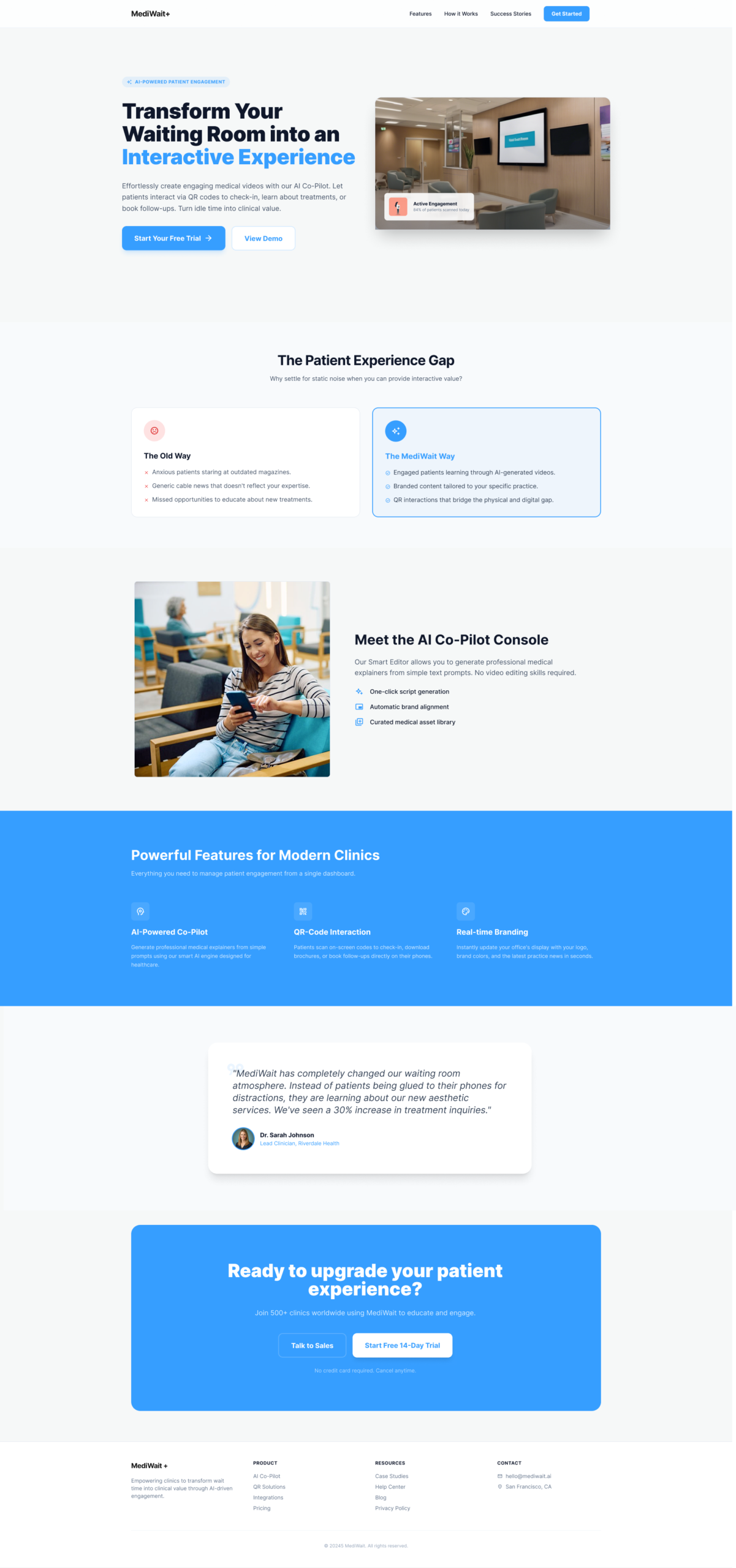 The Product: MediWait+ transforms the stressful waiting room into a smart educational space. I designed a system that uses AI video tools and real-time patient feedback to automatically keep patients calm and engaged.