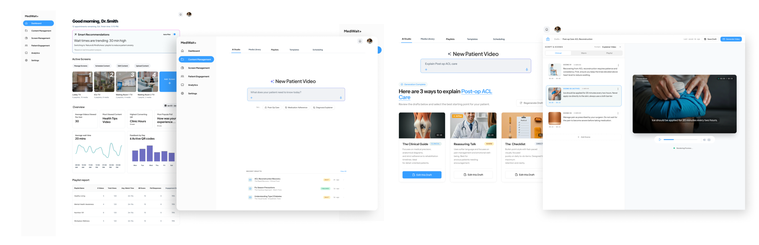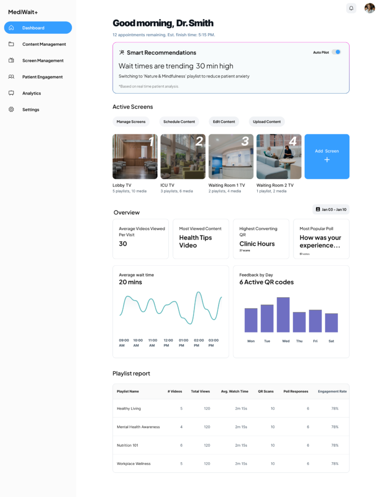 Smart AI Recommendations: The “Hero” of the dashboard. It monitors wait times and patient mood, then suggests the best content to show right now to keep patients calm.